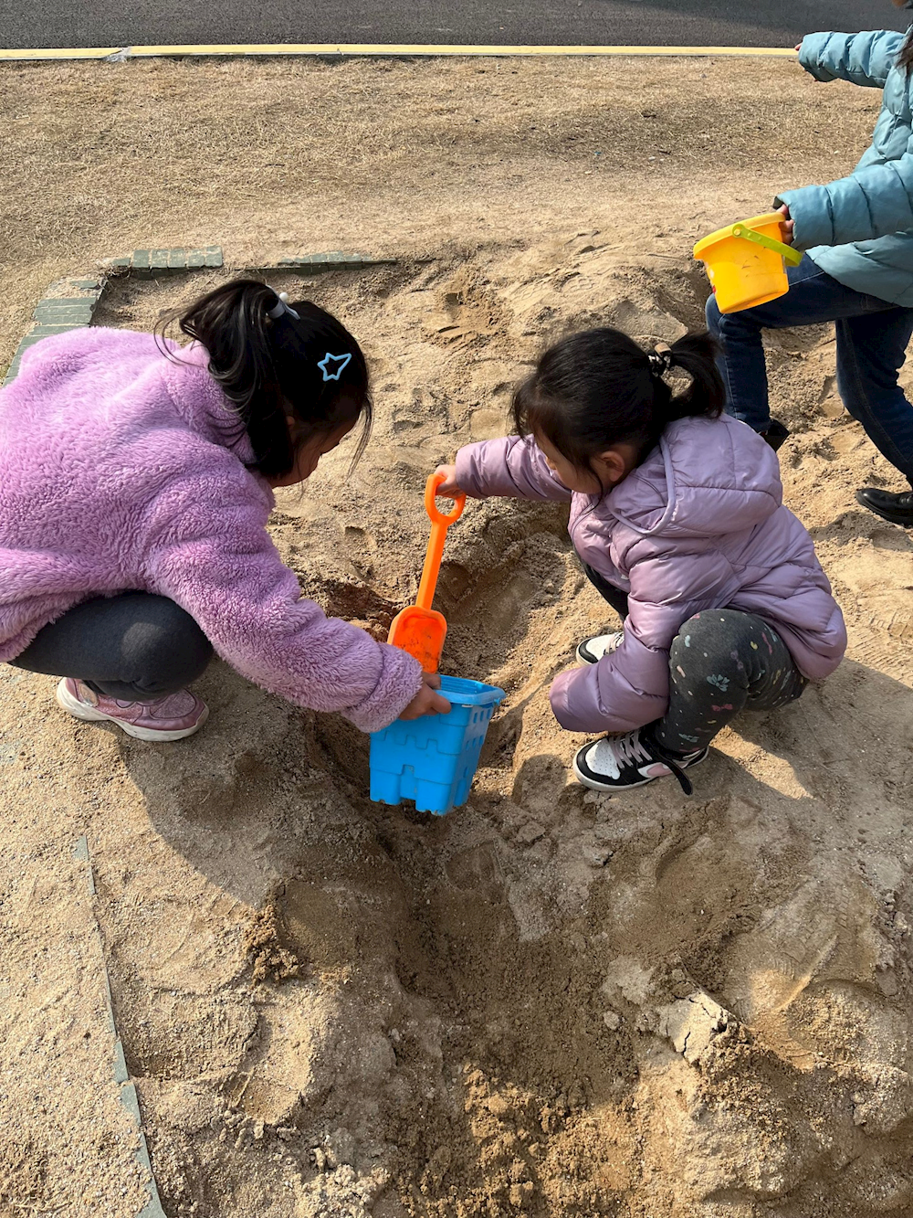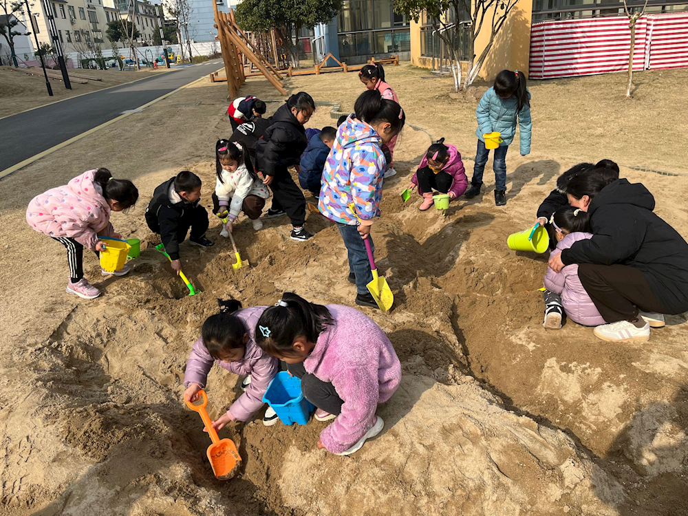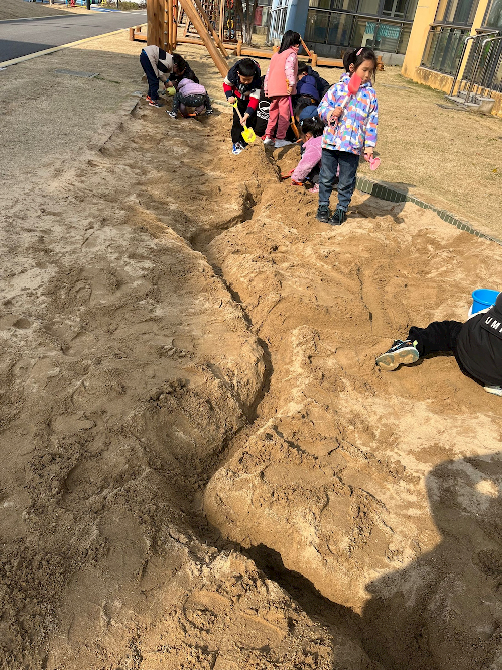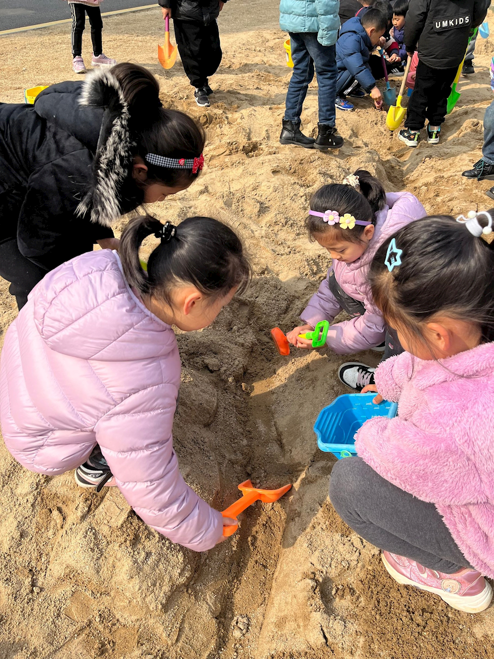 今天我们去玩沙了,合作挖沟,看我们挖的长长的沟!